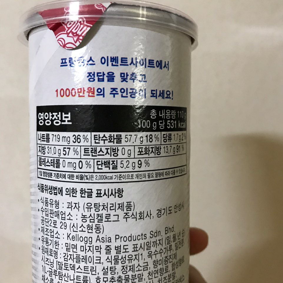 100g당 531kcal... 과자는 배도 안차는데 칼로리는 왜 이렇게 높은지... 한통 다 먹으면.. 584 kcal....ㄷㄷ