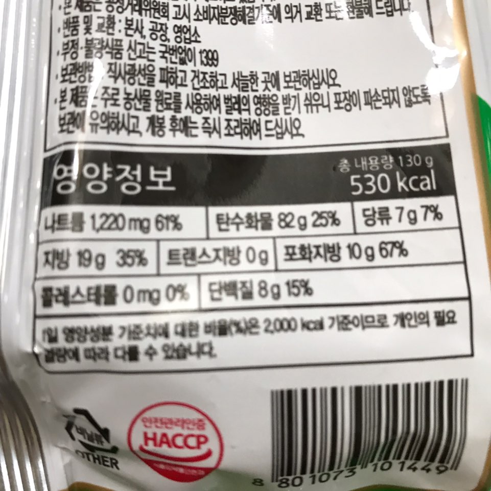 130g으로 530칼로리이네요... 해썹 인증도 있고 믿을수있겟어요 ㅎ