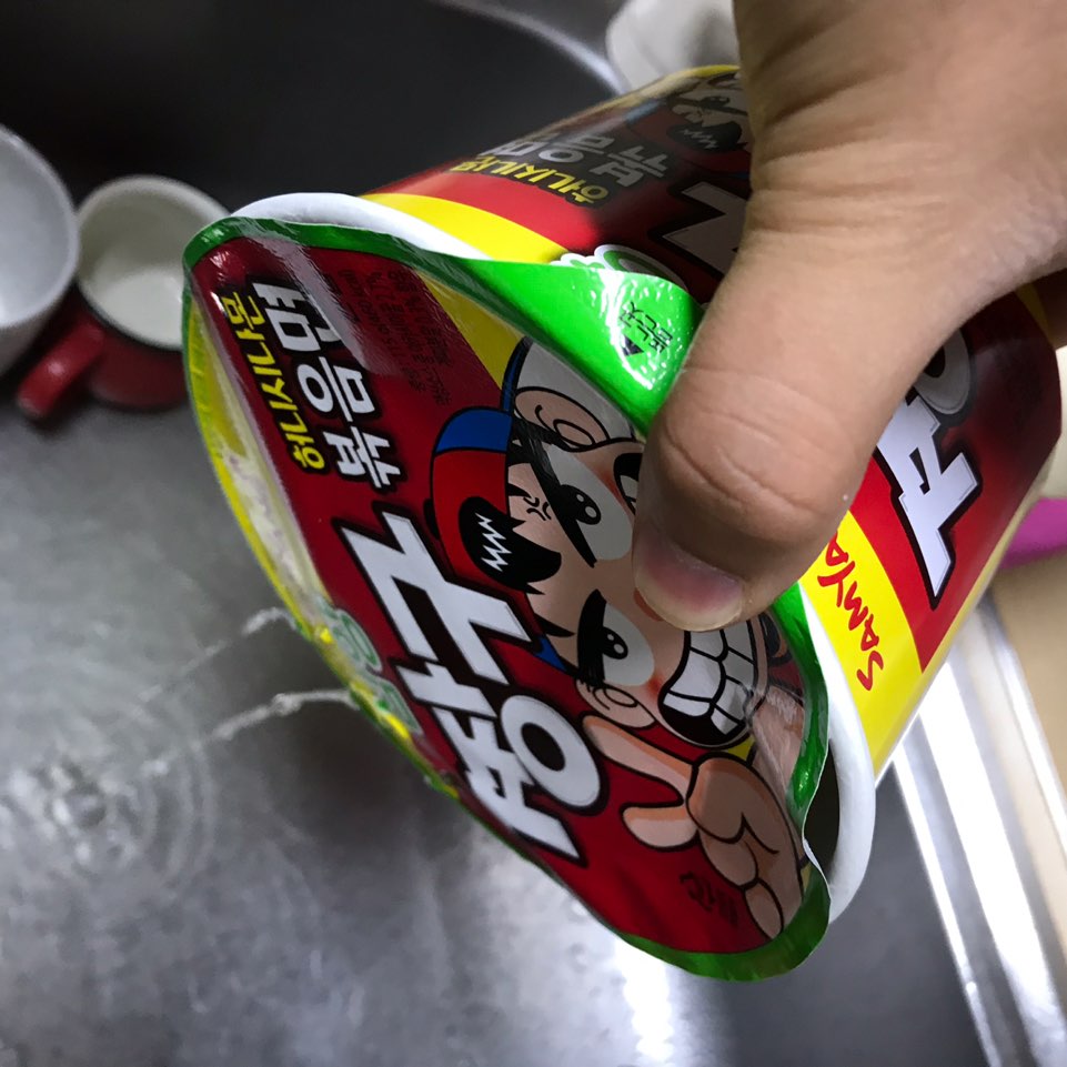 1. 용기의 뚜껑을 열고 후첨 액상소스를 꺼낸 후 끓는 물을 용기 안쪽 표시선까지 부은 다음 뚜껑을 닫고 4분간 기다립니다.