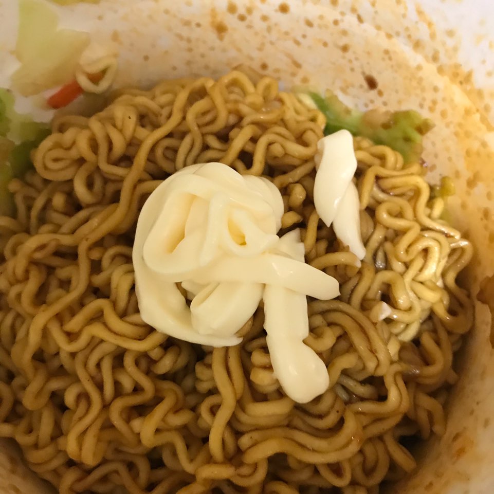 2. 4분 후 뚜껑을 열어 젓가락으로 잘 저은 다음 물을 따라 버린 후 후첨 야끼소바 소스와 후첨 마요 소스를 넣고 잘 비벼 드십시오. (tip, 면이 익을 때까지 4분간 기다리는 동안 소스 2가지를 뚜껑 위에 올리시면 조금 더 깊은 맛을 즐기실 수 있습니다)