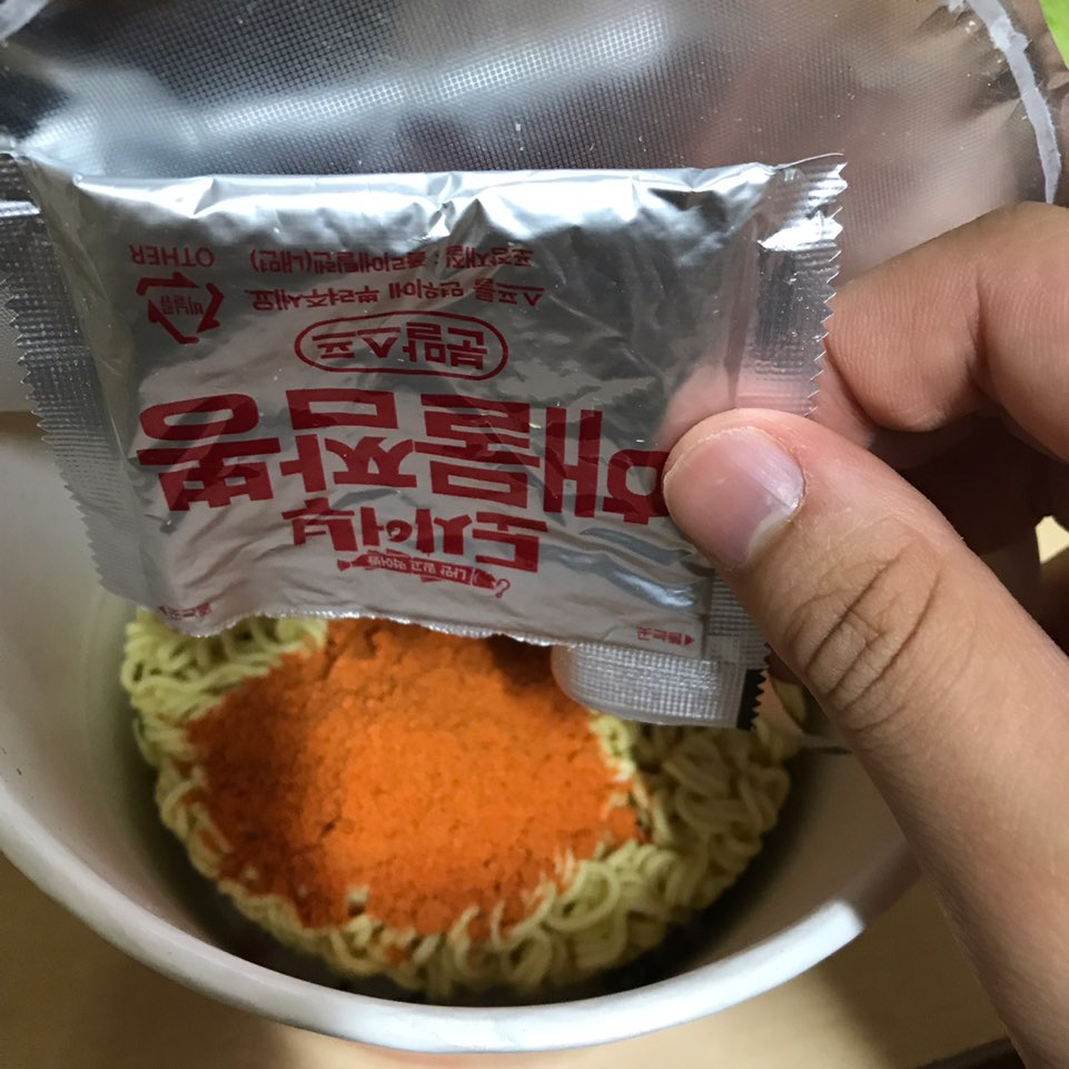 1. 면 위에 분말수프를 넣고