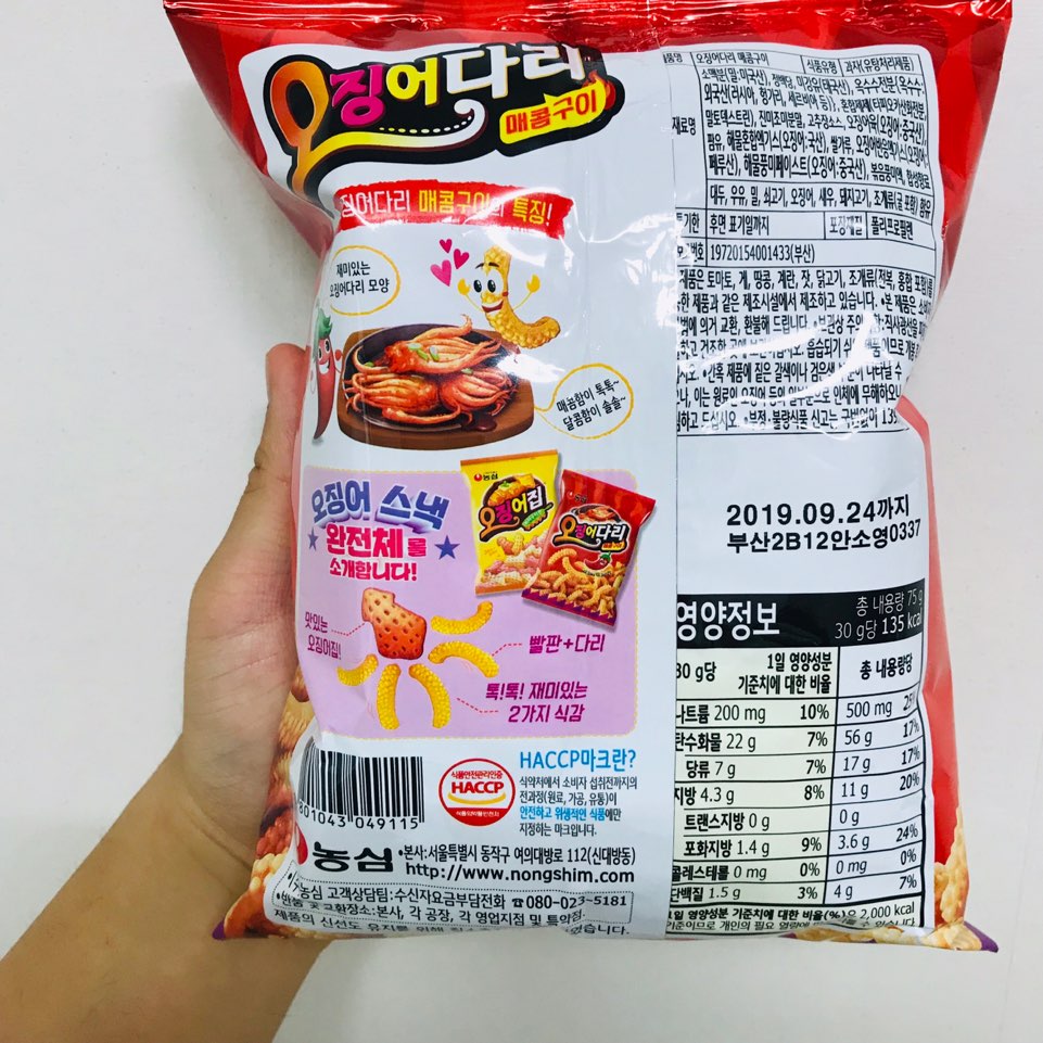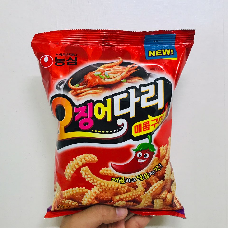안녕하세요! 오늘 제가 소개해드릴 과자는 오징어 다리 매콤 구이 맛입니다. 가격: 1500원!!!