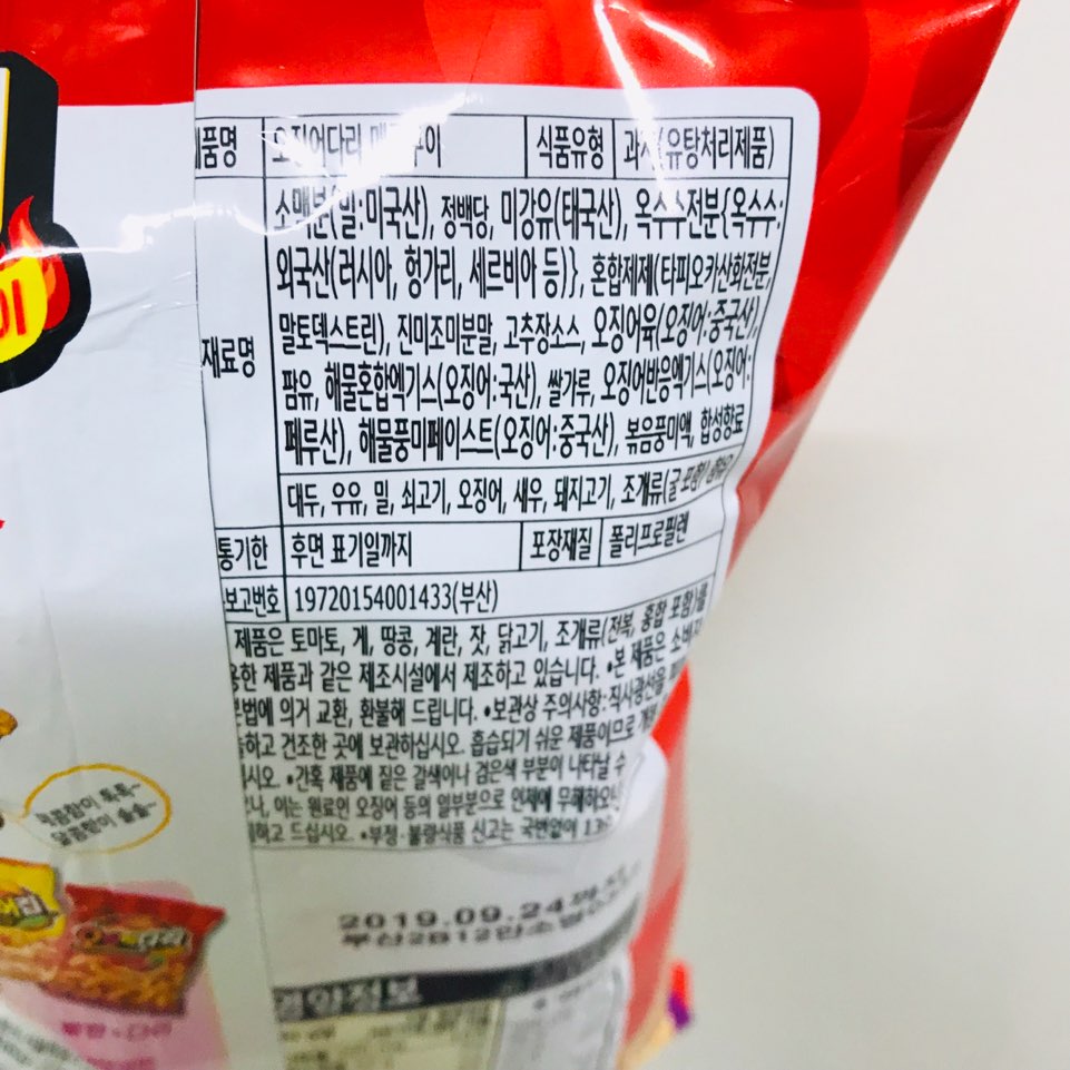 정말 오징어 다리나 오징어 몸통을 칼집 내놓은 거 같죠? 근데 과자 겉에 물엿? 같은 게 묻어 있어서 먹다 보면 손이 찝찝해요.....ㅠㅠ 아주 작게 고춧가루 있는 거 보이시죠!! 고추장 소스가 들어갔데요!