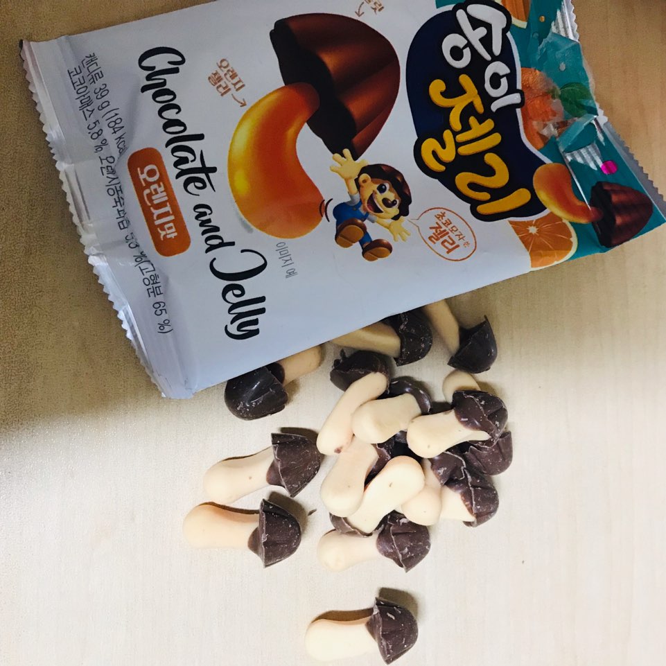 캐릭터가 너무 귀여워요:) 상큼한 오렌지 젤리에 초콜릿이라... 상당히 신박한 맛을 기대하게 되는데요. 기대 반 두려움 반!?